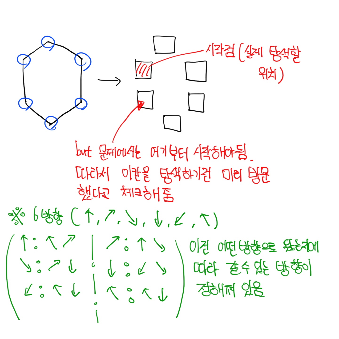그 전에 먼저 육각형을 배열로 표현해 줍시다. 그 후 6방향으로 어떻게 가다가 딱 n번 탐색했을 때 return , n번 탐색하지 않더라도 이미 방문한 칸이었다면 return 절대 시간초과가 될 수 없겠죠.