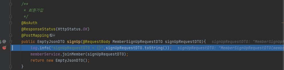interceptor 에 breaking pointer 를 걸어두고 인텔리제이 .http 파일을 사용해서 회원가입 API 를 호출하였습니다.