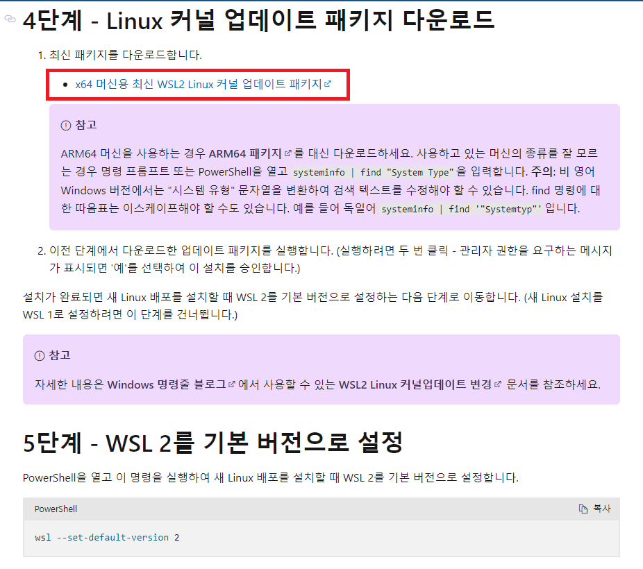 docker 에서 wsl 을 사용하기 위해서는 wsl 버전이 반드시 wsl2 이어야 합니다. 따라서 아래 링크로 들어가 해당 패키지를 설치해주도록 합시다.