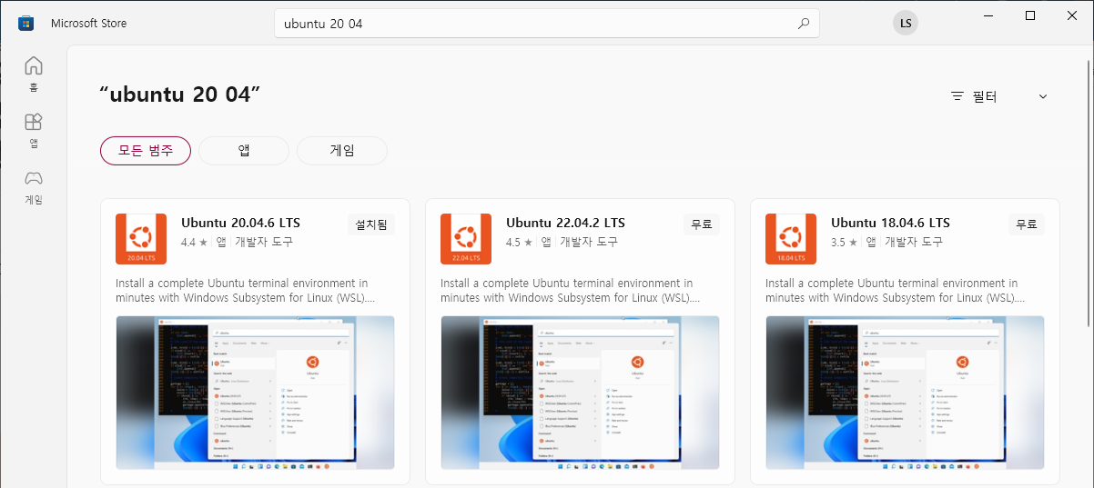 그 후 microsoft store 에 들어가서 Ubuntu 를 설치해주어야 합니다.