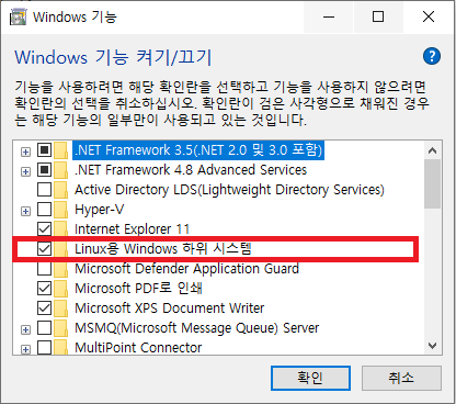 윈도우 [검색] 버튼을 클릭 후 windows 기능 켜기/끄기 버튼을 클릭하면 위와 같은 창이 뜨고 빨간색 네모 박스로 표시한 'Linux용 Windows 하위 시스템' 을 체크해준 뒤 재부팅을 실행합니다.