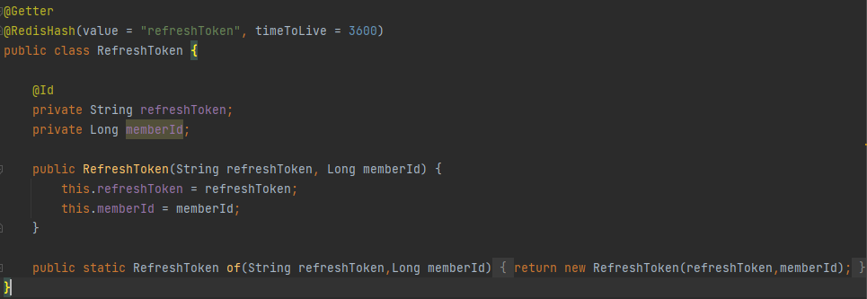 @RedisHash 어노테이션을 RefreshToken entity 에 붙여주고 value 와 timeToLive 옵션을 설정해 주었습니다.