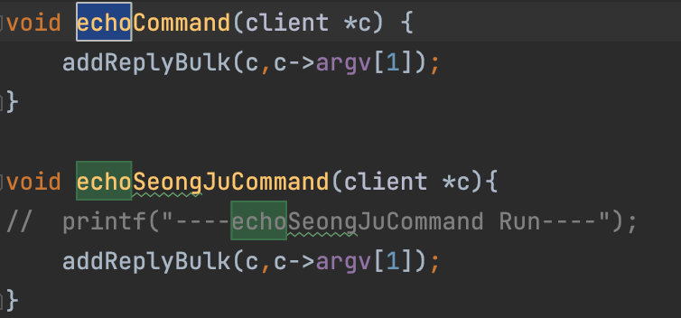 server.c 에 어떤 동작을 할 건지 정의해주었습니다. 사실상 echo 커멘드와 동일한 동작을 하는 소스이니 함수명만 변경한 채로 적용하였습니다. 이때, echoSeongJu 커멘드를 입력하면 진짜로 제가 커스텀한 함수를 호출하는게 맞는지를 확인하기 위해 printf 함수를 사용하여 로그성 문자열을 출력하게끔 하였습니다.